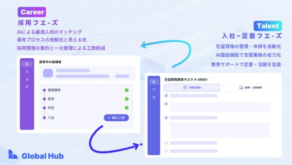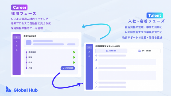 外国人材の採用・定着支援AIプラットフォーム「Global Hub(グロハブ)」を展開する株式会社Linc(本社:東京都千代田区、代表取締役社長:仲 思遥、以下Linc)は、特定技能外国人の受入れ企業、および行政書士向けに、外国人従業員の労務管理・在留資格申請・定着支援を一元化する新サービス「Global Hub Talent(グロハブタレント)」の提供を開始いたしました。
