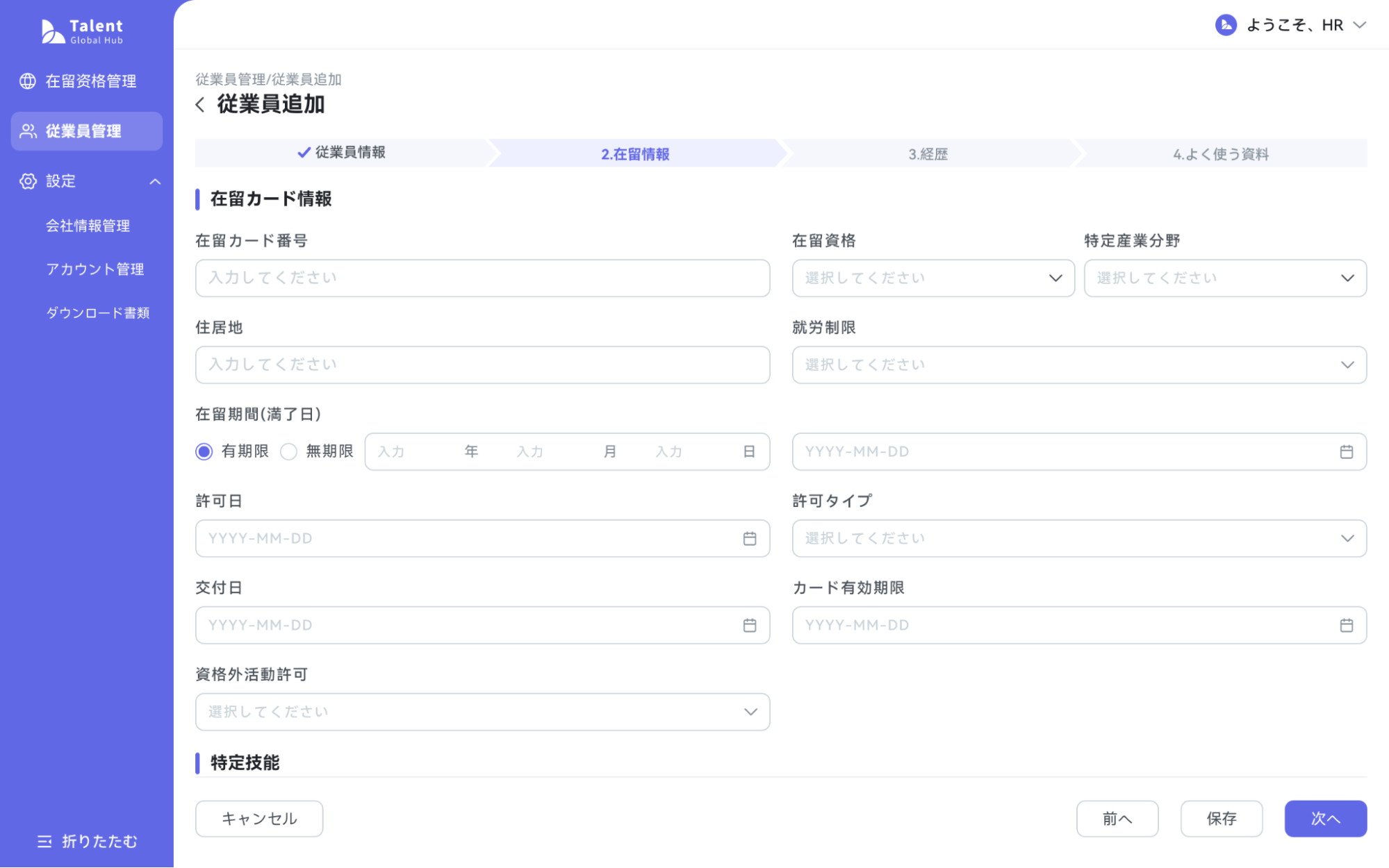 氏名や住所などの基本情報に加え、在留資格の種類、在留期限、満了日などの重要情報をクラウド上でセキュアに一元管理します。パスポートや在留カードなどの必須書類もシステム上にアップロード・保存でき、在留資格更新タスクと紐づけて管理することが可能です。